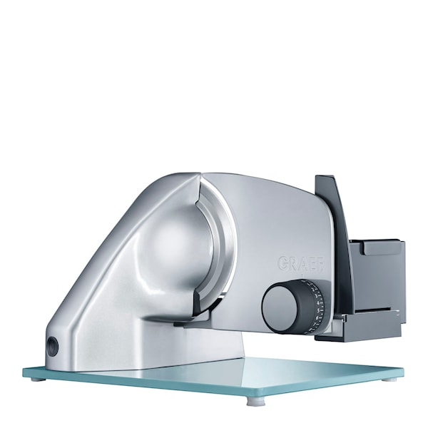 Det här är en skärmaskin från tyska Graef och tillhör serien Vivo. Denna eleganta skärmaskin är tillverkad i Tyskland och är perfekt att ha i köket när man vill skära upp sina egna pålägg. Maskinen är utrustad med en tandad och en slät klinga, allt för att du ska kunna skära både bröd och kött. Tjockleken kan justeras på skivorna från 0-20 millimeter beroende på om du ska skära kött till mackan eller charkbrickan. Den står stadigt på sin plastfot och själva ytterhöljet är gjord i rostfritt stål.