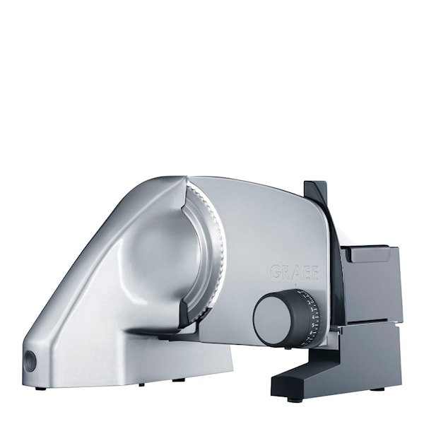 Det här är en skärmaskin från tyska Graef och tillhör serien Vivo. Denna eleganta skärmaskin är tillverkad i Tyskland och är perfekt att ha i köket när man vill skära upp sina egna pålägg. Maskinen är utrustad med en tandad och en slät klinga, allt för att du ska kunna skära både bröd och kött. Tjockleken kan justeras på skivorna från 0-20 millimeter beroende på om du ska skära kött till mackan eller charkbrickan. Den står stadigt på sin plastfot och själva ytterhöljet är gjord i rostfritt stål.
