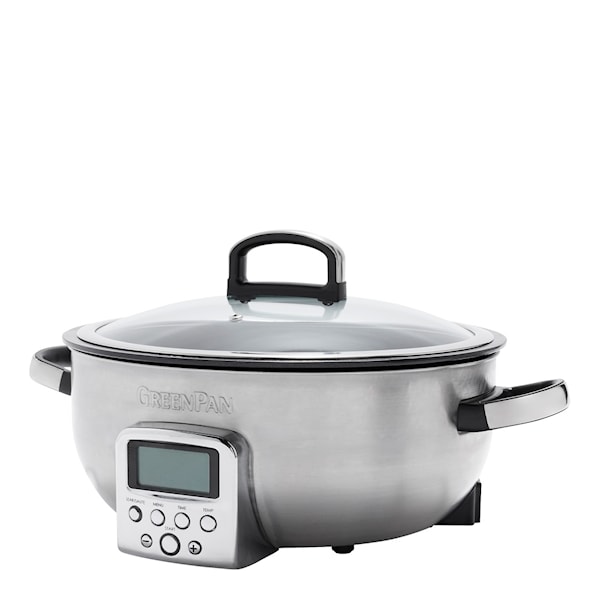 Med Omnicooker från GreenPan får du en mångsidig hjälpreda i köket. Greenpan Omni Cooker rymmer 5,6 liter och är perfekt till den mustiga grytan, biffen eller kanske bara till riskoket. De höga sidorna förhindrar stänk och gör det enkelt att röra om dina ingredienser utan oro.