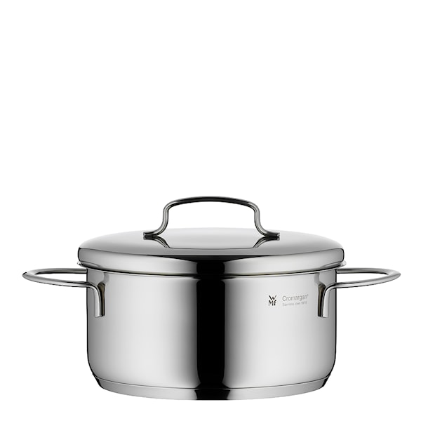 Låg gryta från WMFs serie Mini, en köksserie för det lilla hushållet. Grytan rymmer 1,5 liter och har ett tättslutande lock. Den är tillverkad av Cromargan®-stål, och med en s k TransTherm®-basplatta, vilken snabbt absorberar och fördelar värmen för bästa resultat. Grytans handtag är ihåliga för att reducera värme då du lyfter av den från plattan. Kastrullkanten är rejält tilltagen för att förhindra spill.