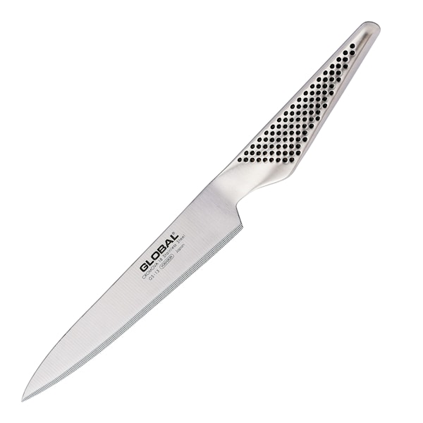 GS-13 från Global Classic är en tandad mindre allkniv. Den fintandade eggen gör ett bra snitt på frukt och grönsaker med mjukt skal om annars kan vara besvärligt att skära igenom. Den passar utmärkt för exempelvis tomat eller mango.