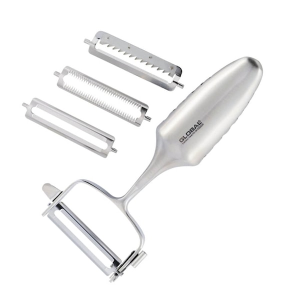 Global GS-94 Classic universalskalare i T-format är ett professionellt verktyg med tre utbytbara blad som gör köksarbetet både enklare och mer exakt. Använd det raka bladet för rotfrukter, det tandade bladet för mjukare frukter och juliennebladet för att skapa tunna strimlor.