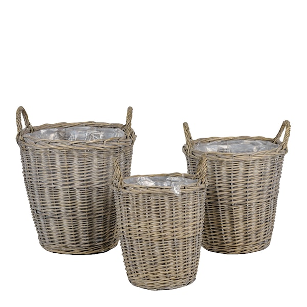 Upptäck detta stilfulla 3-pack korgar från Gus, med storlekarna 30 cm, 35 cm och 40 cm, tillverkade av elegant flätad grå pil. Dessa korgar har en plastbelagd insida, vilket gör dem idealiska som ytterkrukor för dina växter, samtidigt som de skyddar mot fukt. Utöver att vara perfekta för att visa upp dina favoritväxter, är korgarna också utmärkta för förvaring av småsaker, vilket hjälper till att hålla ditt hem organiserat och prydligt. Med deras naturliga och sofistikerade design blir dessa korgar en både praktisk och dekorativ detalj i varje rum.
