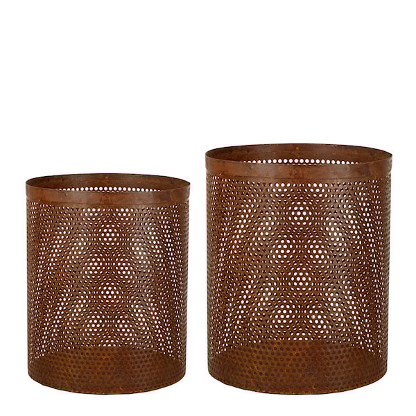 Upptäck det charmiga 2-pack runda lyktor från Gus, med storlekarna 30 cm och 25 cm i en attraktiv rostig finish. Dessa lyktor är tillverkade av robust metall och är designade för utomhusbruk, vilket gör dem idealiska för att skapa en mysig atmosfär på din uteplats eller i trädgården. Med sin snygga cylindriska form och den rostiga metallens grova uttryck, tillför dessa lyktor en rustik och industriell känsla till din utomhusinredning. Perfekta för att lysa upp kvällar utomhus med sitt varma sken, blir dessa lyktor både en dekorativ och funktionell tillgång i ditt hem.