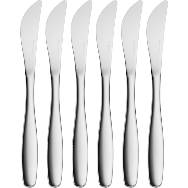 Knivarna mäter 20 cm och levereras i ett set om sex delar. De är särskilt lämpade som middagsknivar till kött, fisk, kyckling, vegetariska rätter och pasta. De ger god kontroll vid servering av huvudrätter och kompletterar Savonia-serien till en komplett bestickuppsättning. Tillverkade i rostfritt stål för hållbar användning i vardagen. Savonia-bestick kan diskas för hand eller i diskmaskin. Skölj av matrester direkt efter användning, se till att besticken har tillräckligt med utrymme i maskinen och undvik långvarig blötläggning.