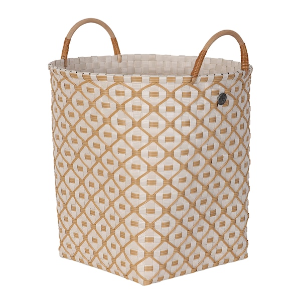 Den är handflätad i återvunnen plast, med handtag i rotting och detaljer i bambu och PU-läder. En utmärkt lösning för förvaring av filtar, handdukar eller magasin – både i vardagsrum och sovrum.