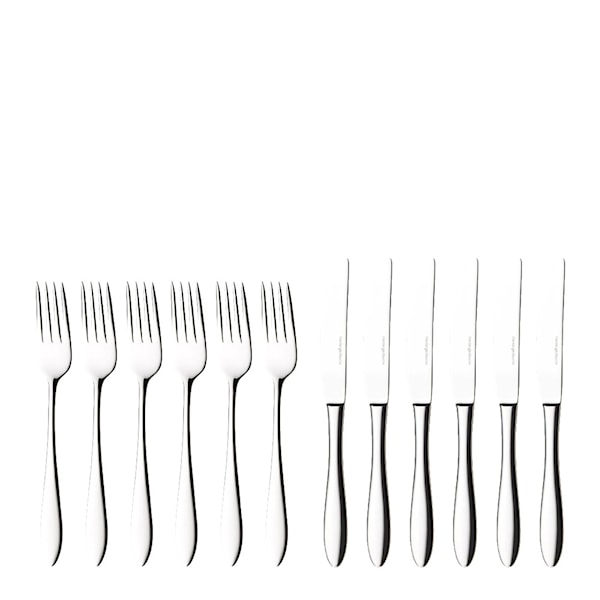 Fjord förrättsbestick från Hardanger bestikk, med tolv delar som inkluderar sex knivar och sex gafflar, är utformade för att ge din matupplevelse en touch av förfining. Tillverkade av högkvalitativt 18/10 rostfritt stål, garanterar de både långvarig hållbarhet och en strålande finish, med tryggheten av en livstidsgaranti.