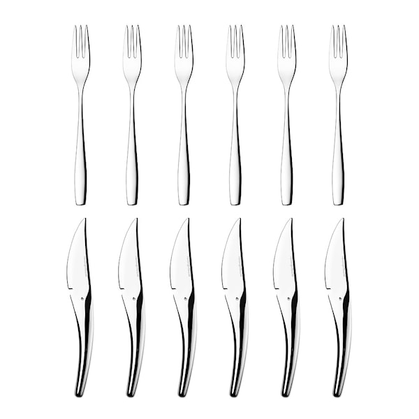 Det lilla hacket i bladet ger ökad kontroll, och gafflarna gör det enkelt att servera eller doppa fruktbitar i choklad och grönsaker i fondue. Den polerade ytan ger setet ett elegant skimmer, och det levereras i en exklusiv presentlåda – perfekt som gåva eller till det dukade bordet hemma.