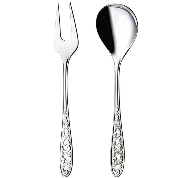 Serveringsset med 2 delar från den exklusiva Kristin-serien av Hardanger Bestikk. Besticken är framställda med en särskild teknik som är inspirerad av traditionell norsk träskärning. Setet inkluderar en serveringssked och en serveringsgaffel, båda med bekväma handtag och ett praktiskt djup som gör serveringen enkel och smidig. Besticken är tillverkade av högkvalitativt 18/10 rostfritt stål, som tål diskmaskin och har livstidsgaranti. Setet kommer i en elegant presentförpackning och innehåller: