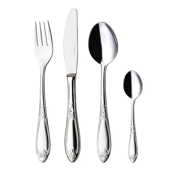Bestickset för 6 personer från Hardanger Bestikk. Bestickserien Nina formgavs 1998 av Odd Leikvoll, och är inspirerad av rokoko-perioden i slutet av 1600-talet, vilken kännetecknas av sina vackra blommönster. Besticken passar in i den romantiska dukningen, i sommarstugan eller bersån. Alla bestick från Hardanger innehåller 18% krom och 10% nickel i det rostfria stålet, en ovärderlig kvalitet som har mycket lång hållbarhet.