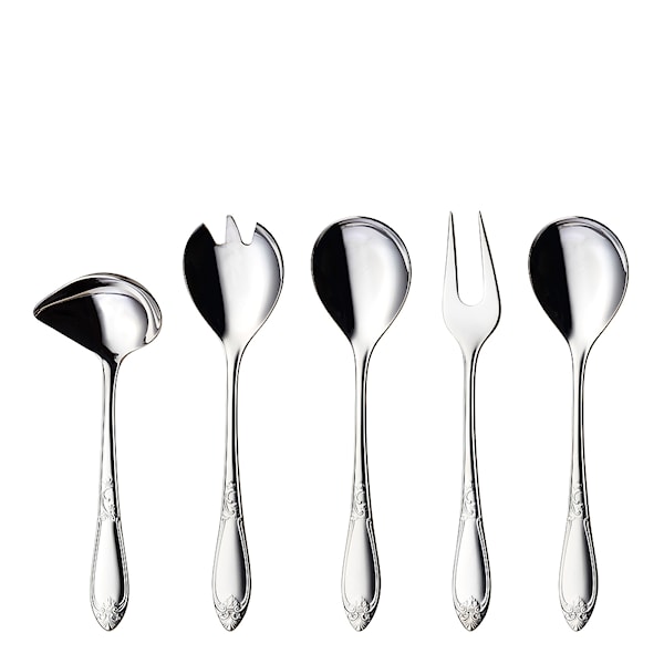 Serveringsset i 5 delar från Hardanger Bestikk. Bestickserien Nina formgavs 1998 av Odd Leikvoll, och är inspirerad av rokoko-perioden i slutet av 1600-talet, vilken kännetecknas av sina vackra blommönster. Besticken passar in i den romantiska dukningen, i sommarstugan eller bersån.