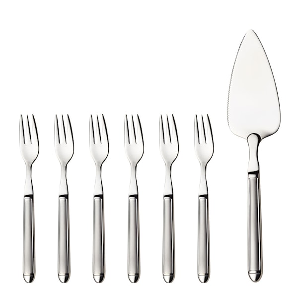 Tårtset från den robusta och ikoniska Nora-serien. Designad av Odd Leikvoll 2001. Tårtsetet innehåller en fintandad tårtspade som ger en precis skärkant. De yttersta tänderna på tårtgafflarna är lite bredare och delar därför tårtbiten bestämt. Levereras i presentförpackning.