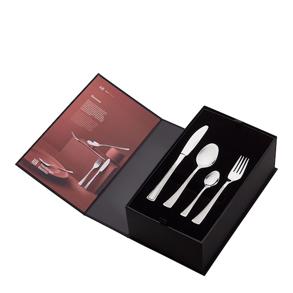Besticksetet med 48 delar från den älskade och ikoniska Ramona-serien av Hardanger Bestikk kombinerar enkelhet med elegant design. Med sina borstade ytor och raka kanter erbjuder detta set en perfekt balans mellan funktionalitet och estetik. Tillverkat av högkvalitativt 18/10 rostfritt stål, är besticken diskmaskinssäkra och levereras med livstidsgaranti. Setet, som levereras i en vacker presentförpackning, innehåller allt du behöver för att duka för sex personer: