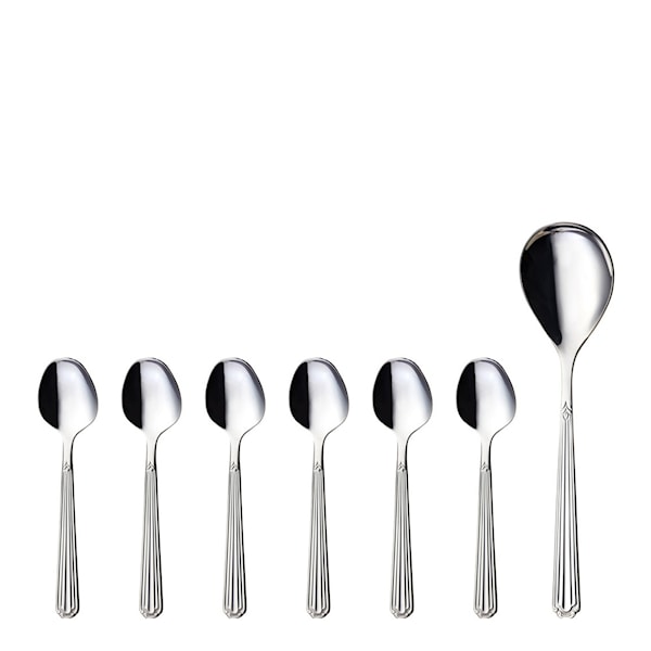 Fördjupa dina dessertupplevelser med detta eleganta dessertset från den förnäma Renässans-serien. Skapat av den välkända designern Haakon Amundsen, kombinerar detta set både stil och funktion. Djupa utskärningar på besticken bidrar till ökat motstånd mot repor, vilket garanterar lång hållbarhet. Serverskeden har ett greppvänligt handtag och ett bra djup för smidig servering, medan dessertskedarna är större, längre och djupare än vanliga teskedar, vilket gör dem idealiska för alla typer av desserter. Setet levereras i en elegant presentförpackning, vilket gör det till en utmärkt gåva.