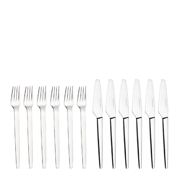 Tina förrättsbestick, 12 delar, från Hardanger Bestick. Designad av Per Finne 2010. Detta minimalistiska bestick kännetecknas av sina rena linjer, balanserade viktfördelning och noggrant genomtänkta taktila egenskaper. Skaftet är utfört i monoblock och har en polerad finish.