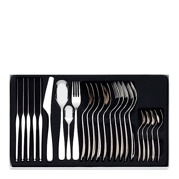 Bestickset Tuva, 24 delar, från Hardanger är designat av Per Finne 2009 och har bland annat vunnit designpriset The Innovation Award for Universal Design 2011 vilket man kan förstå. Bestickens stilrena och enkla design med mjukt rundade kanter och polerad finish är inte bara vackra utan har även en god balans som gör att de ligger bekvämt i handen.