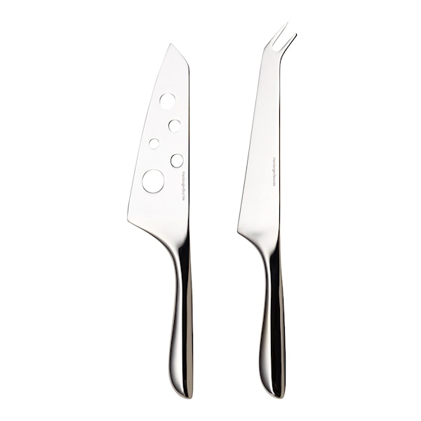 Ett Ostset med 2 knivar från Hardanger Bestikk, formgiven av Per Finne. De rena formerna passar väl in i det moderna hemmet. Alla bestick från Hardanger innehåller 18% krom och 10% nickel i det rostfria stålet, en ovärderlig kvalitet som har mycket lång hållbarhet.