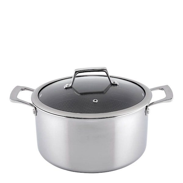 Upptäck Haws Santo gryta med lock 5,8 L silver/svart – en stor gryta som ger pålitliga resultat varje gång. Grytan har 3-lagers stål och slitstark hybridbeläggning för jämn värmefördelning och effektiv matlagning. Hybridbeläggningen gör att du kan använda metallredskap utan att skada ytan.