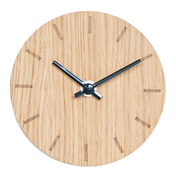 Varje klocka är unik, med träets naturliga årsringar som tillför karaktär och charm. Den levereras med ett praktiskt ställ i matchande ek, och du kan anpassa uttrycket genom att välja visare som antingen framhävs eller smälter diskret in i urtavlan.