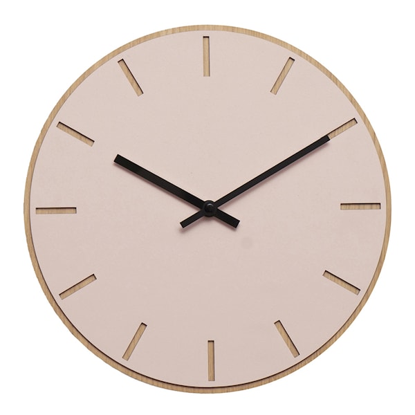 Powder väggklocka från Hemverk är en harmonisk kombination av dimrosa linoleum och ljus ekfaner, vilket ger klockan ett mjukt och minimalistiskt uttryck. Med en diameter på 28 cm och utskurna timmarkeringar framhävs tidens gång på ett subtilt sätt. De svarta visarna skapar en tydlig kontrast mot den ljusa rosa ytan och tillför en modern, nordisk känsla som passar perfekt i alla hem.