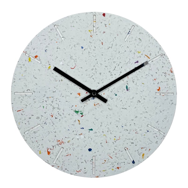 Hemverk RECY väggklocka tillför hemmet en hållbar och modern stil med sin unika bakgrund av återvunnen plast. Klockan, som mäter 28 cm, har en färgglad, fläckig yta som gör varje klocka till ett unikt konstverk. Den minimalistiska designen med svarta visare skapar en elegant kontrast mot den flerfärgade bakgrunden, vilket ger klockan ett lekfullt men sofistikerat uttryck.