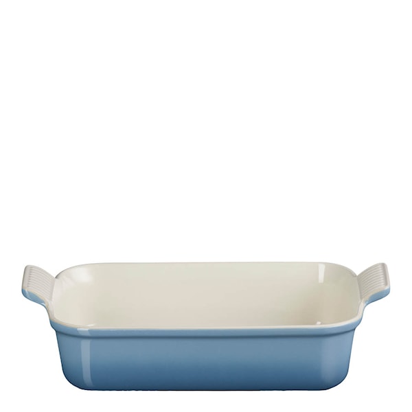 Rektangulär form i stengods från Le Creuset och serien Heritage. Formen har en innerlängd på 26 centimeter och en volym på 2,4 liter. Ugnsformen är gjord av stengods som fördelar värmen jämnt. Keramiken är värmebeständig från -23 °C till +260 °C. Stengodsformen är glaserad vilket gör den reptålig och enkel att rengöra.