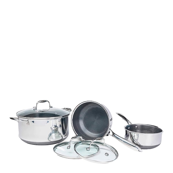 Hybrid Kastrullset 6 delar från HexClad är ett exklusivt set med tre kokkärl i olika storlekar – 1,9, 2,8 och 7,5 liter – samtliga med lock. Perfekt för både vardagsmat och festliga middagar.