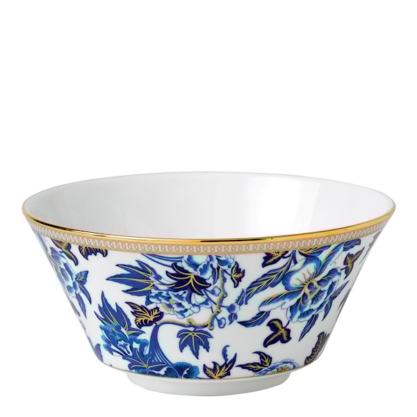 Hibiscus är en slående design av blå nyanser, rikt utsmyckade med guld. Ett elegant utseende och rik finish. En skål perfekt för frukostflingorna, snackset eller glassen.