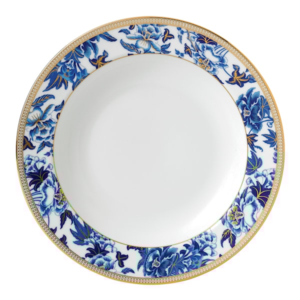 Hibiscus är en slående design av blå nyanser, rikt utsmyckade med guld. Ett elegant utseende och rik finish. Använd djupa tallriken till filen på morgonen eller soppan till middag. Fungerar också som en mindre serveringsskål.