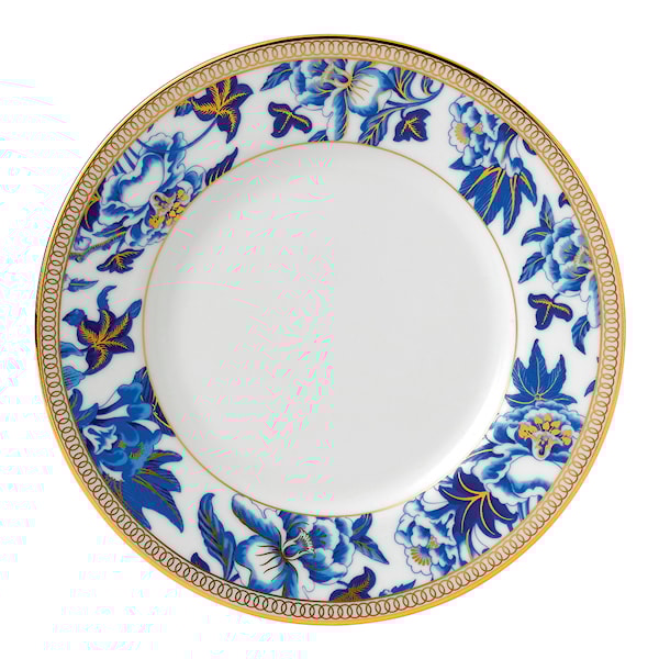 Hibiscus är en slående design av blå nyanser, rikt utsmyckade med guld. Ett elegant utseende och rik finish. Denna storlek på tallrik är perfekt till frukost, förrätten eller desserten. Kan kombineras med resten av serien eller tillsammans med en exempelvis helvit serie.