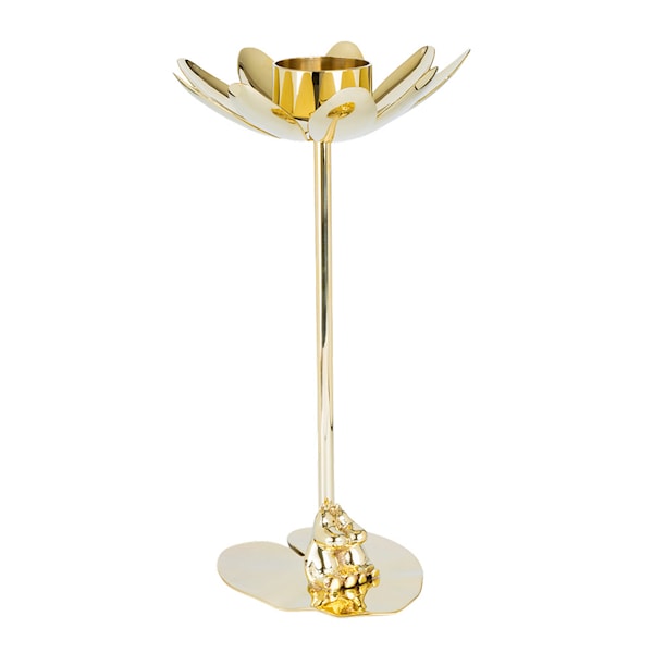 På ett näckrosblad sitter Mumin och Snorkfröken i en stilla omfamning, skyddade av en blomma ovanför dem – en vacker symbol för samhörighet och värme. Ljusstaken fångar detta ögonblick med varsam detaljrikedom och poetisk balans.