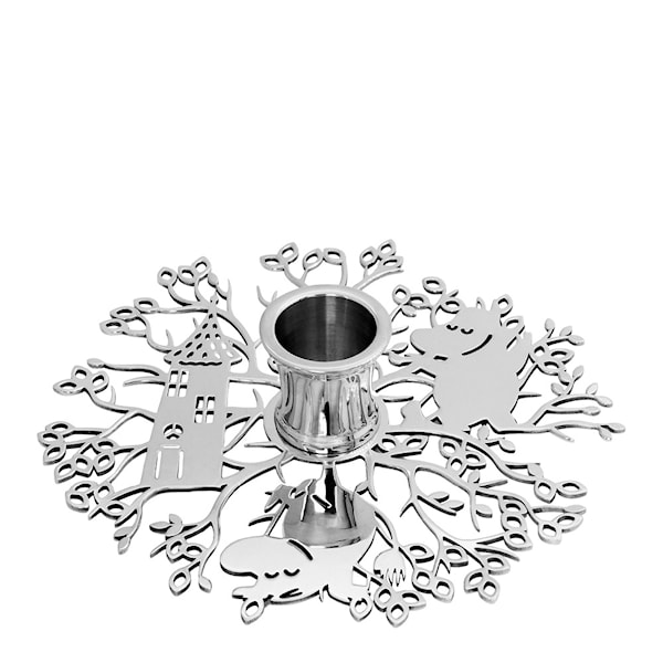 Hilke x Mumin No.1 ljusstake på 13,2x3,3 cm är resultatet av ett exklusivt samarbete mellan Hilke Collection och Mummi. En ljusstake vackert illustrerad och inspirerad av den första boken om Mumintrollen, 'Småtrollen och den stora översvämningen', där karaktärer från Mumintrollen kan ses gömma sig bland trägrenarna, skyddade från stormen, medan de väntar på att hela familjen ska samlas i Muminhuset.