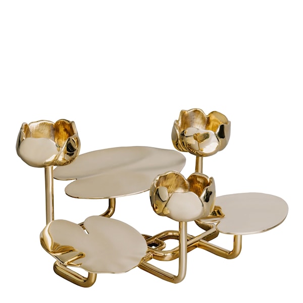 Hilke Collection Ninfea Grande ljushållare i massiv mässing är ett dekorativt och funktionellt objekt inspirerat av näckrosens symbolik. Med sitt italienska namn, som betyder just näckros, förmedlar den både skönhet och balans i form.