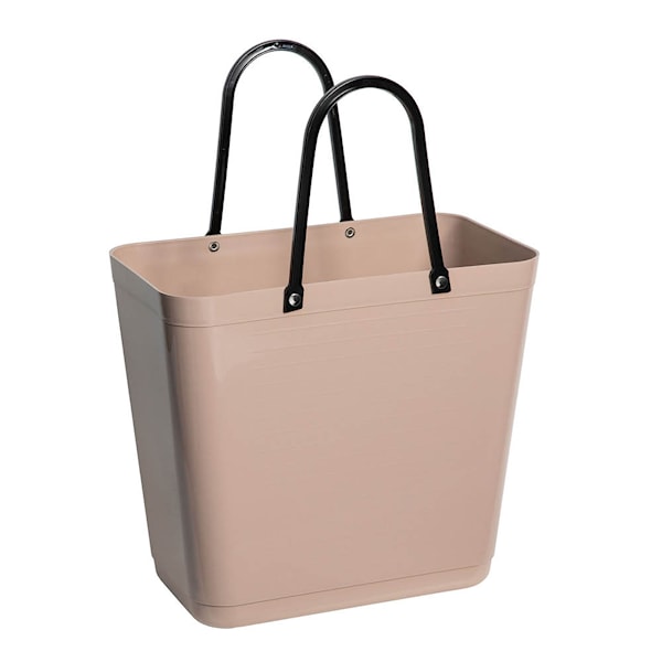 Hinza's Recycled Plastic väska, med en volym på 14 liter, är en praktisk och slitstark följeslagare. Tillverkad i Sverige av återvunnen plast, den står stadigt och är lätt att rengöra. Den höga formen gör den särskilt användbar för att bära flaskor när du handlar istället för att använda butiksplastpåsar.