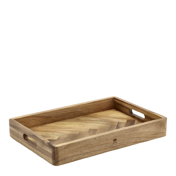 Denna stilrena serveringsbricka från HOLM är tillverkad av FSC®-certifierat akaciaträ och mäter 45,7 x 30,5 x 6,3 cm. Den är designad med höga kanter och bärhandtag för säker och smidig servering. Det eleganta fiskbensmönstret ger brickan ett stilfullt uttryck samtidigt som det bidrar till funktionaliteten.