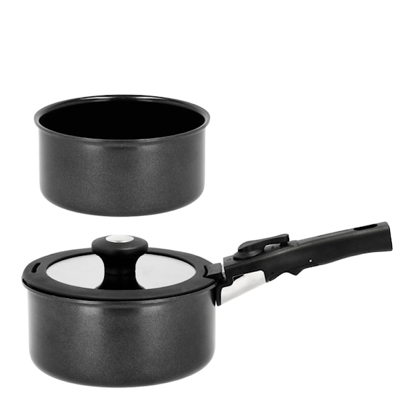 Detta grytset från Holm består av en kastrull på 1,1 liter, en gryta på 2,4 liter med glaslock samt ett avtagbart handtag som ger maximal flexibilitet. Grytorna är tillverkade av aluminium med en hållbar svart keramisk beläggning som säkerställer effektiv värmefördelning och minskar risken för att maten bränner fast.