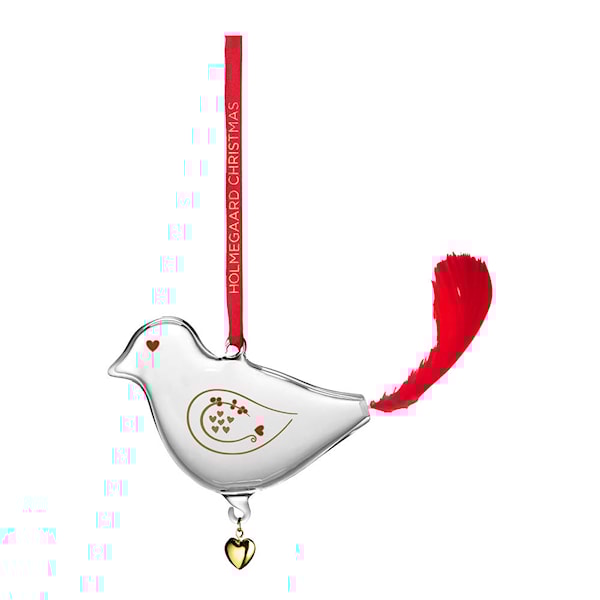 Den lilla julfågeln 2025 från Ann-Sofi Romme är tillverkad i munblåst glas och har en längd på 14 cm. Med motiv i rött och guld och en elegant form blir den ett romantiskt tillskott till Holmegaards 200-års-jubileumsserie – hängs med sidenband.