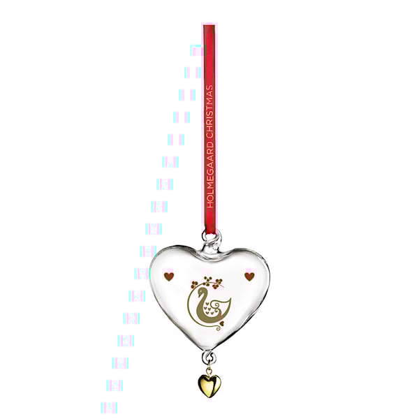 Ann-Sofi Rommes julehjärta 2025 från Holmegaard är en stilfull glaskula i hjärtform, 8 cm hög. Munnblåst och dekorerat med röda hjärtan, gulddetaljer och en svan – ett tidlöst motiv som firar Holmegaards 200 år.