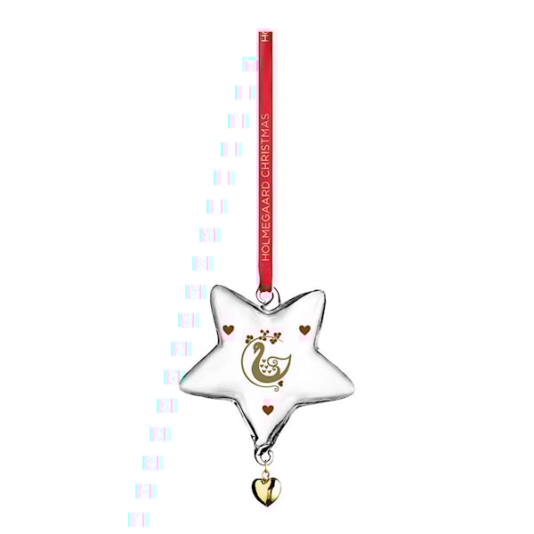 Ann-Sofi Rommes julstjärna 2025 är tillverkad i munblåst glas och 8,5 cm hög. Motiven i rött och guld – med svan, hjärtan och bär – ger ett klassiskt uttryck.