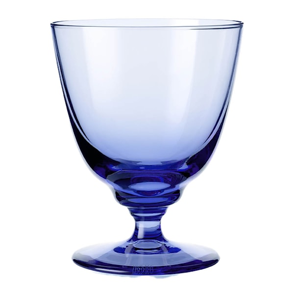 Vinglaset i mörkblått rymmer 35 cl och skapar ett levande och harmoniskt uttryck på bordet. Det har samma form som vattenglaset i serien, men har fått ett litet lyft. Inspirationen till det låga vinglaset har hämtats från Holmegaards arkiv, där det förr i tiden var vanligt med lägre vinglas. Idag innebär den diskreta lilla foten att vinglaset i Flow-serien fungerar perfekt som ett avslappnat allroundvinglas för rött, vitt, rosé och allt med bubblor.