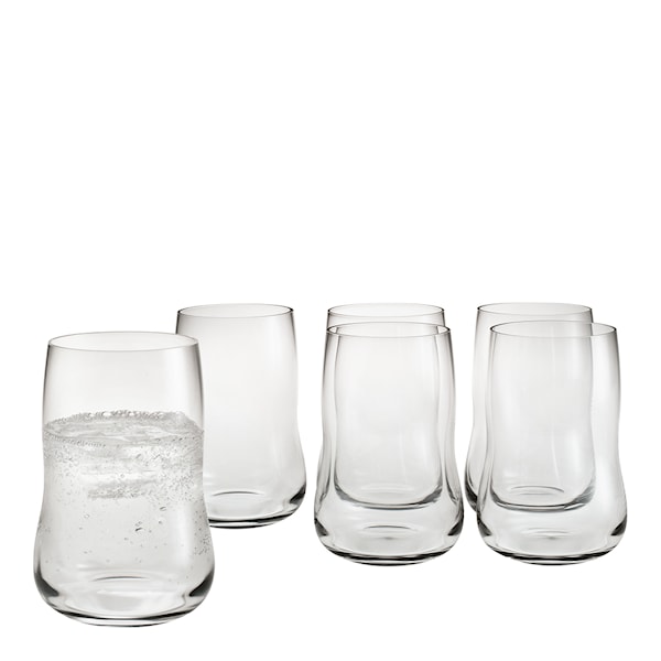 Glas i 6-pack från Holmegaards serie Future designat av Peter Svarre. Med framtiden som inspiration kommer de här vågiga glasen liva upp dukningen både till vardags och fest.