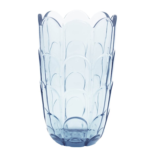 Den fina vasen i färgen blue iris är 19 cm hög och som en söt liten detalj lägger sig stjälkarna vackert runt de små fördjupningarna längs kanten när buketten vecklas ut. På så sätt är det rent visuellt blombladen på vasen som bär buketten, medan vasen som en vacker förlängning omfamnar buketten och stöder stjälkarna. Det blåtonade glaset innebär att du inte behöver nöja dig med toppen av buketten, utan får glädje av blommornas hela längd och Lily-seriens vackra reflektioner i glaset när du tittar på buketten.