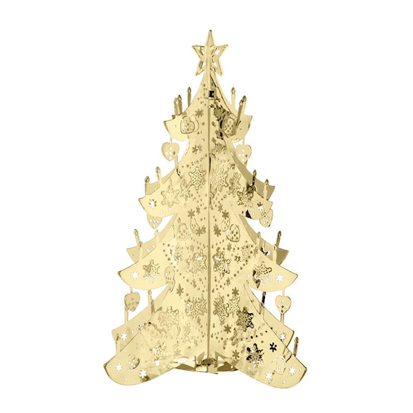 Vackert detaljerad minijulgran i skimrande guldmetall