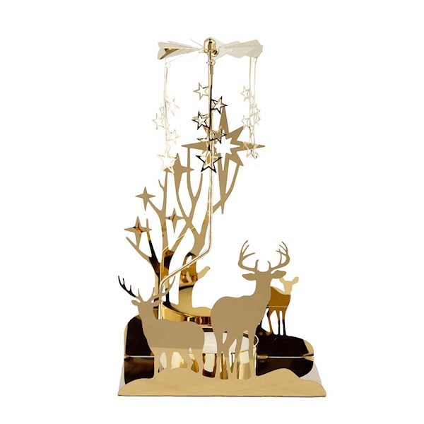 När värmeljuset tänds får värmen de dekorativa delarna upptill att snurra stillsamt, och ett mjukt, gyllene sken dansar i takt med rörelsen. Den roterande effekten skapar en rogivande och nostalgisk atmosfär, perfekt för mörka vinterkvällar, adventstid eller som en vacker del av juldekorationen.