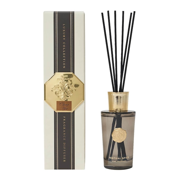 Med sin gråtonade glasflaska och svarta pinnar är den både dekorativ och effektiv – perfekt som present eller som en del av din egen vardagslyx.