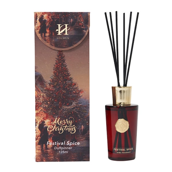 Holmen Vittoria doftpinnar Festival Spice förenar ett dekorativt uttryck med en klassisk och stämningsfull juldoft av äpple och kanel. Den röda glasflaskan med gulddetaljer ger ett elegant intryck, och de svarta pinnarna sprider doften jämnt över flera veckor.