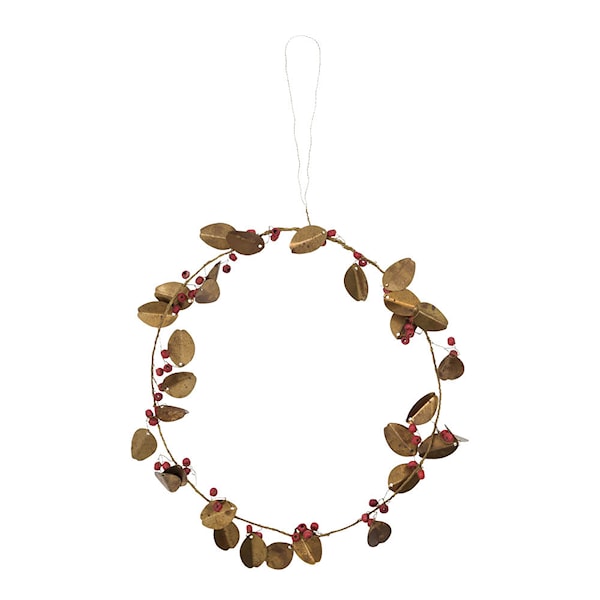 House Doctor Auric krans 20 cm guld är en handgjord julkrans med dekorativa material och tydlig form. Kransen består av gyllene mässingsblad och röda träpärlor som tillsammans skapar ett traditionellt och elegant uttryck.