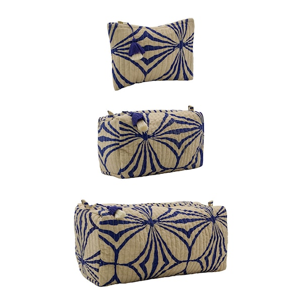 House Doctor Care Set necessär 3-pack blå är ett vackert och praktiskt sätt att förvara dina viktigaste produkter. Setet består av necessärer i tre olika storlekar i krämfärgad bomull med ett blått, grafiskt mönster. Varje necessär har en dragkedja med tofs som ger en fin handgjord känsla.