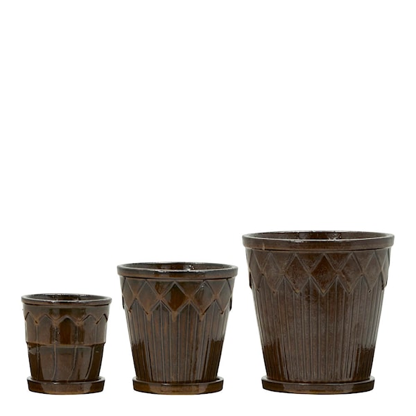 House Doctor Cora blomkrukor i ett set om 3 ger ett varmt och inbjudande uttryck till ditt hem. De är tillverkade i glaserat lergods med en mörkbrun färgton och dekorativ struktur som fångar ögat. Det geometriska mönstret tillför en taktil dimension som lyfter varje växt.
