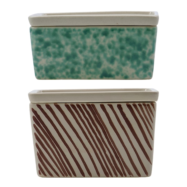 Burkarna kan staplas för smidig förvaring och är perfekta för allt från snacks och smårätter till smör eller kryddor. Använd dem var för sig eller som ett dekorativt par som framhäver din personliga stil i hemmet.
